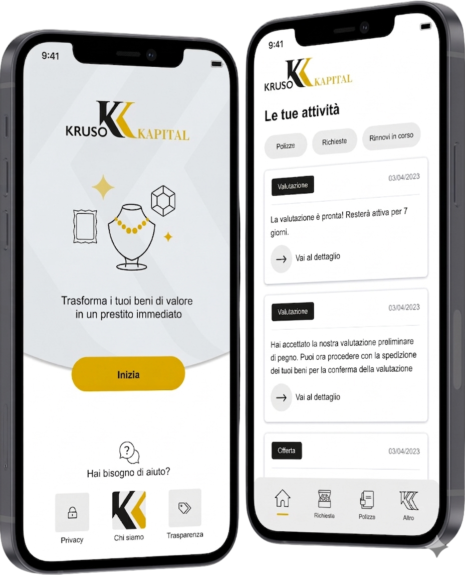 Un'unica App per richiedere ed ottenere comodamente online un prestito veloce e sicuro con la garanzia di oggetti in oro, gioielli e orologi preziosi: inviandoci una semplice foto potrai richiedere una valutazione gratuita e preliminare dei preziosi che desideri lasciare in garanzia per ottenere il prestito. Dalla richiesta all'erogazione, il prestito è tutto digitale!